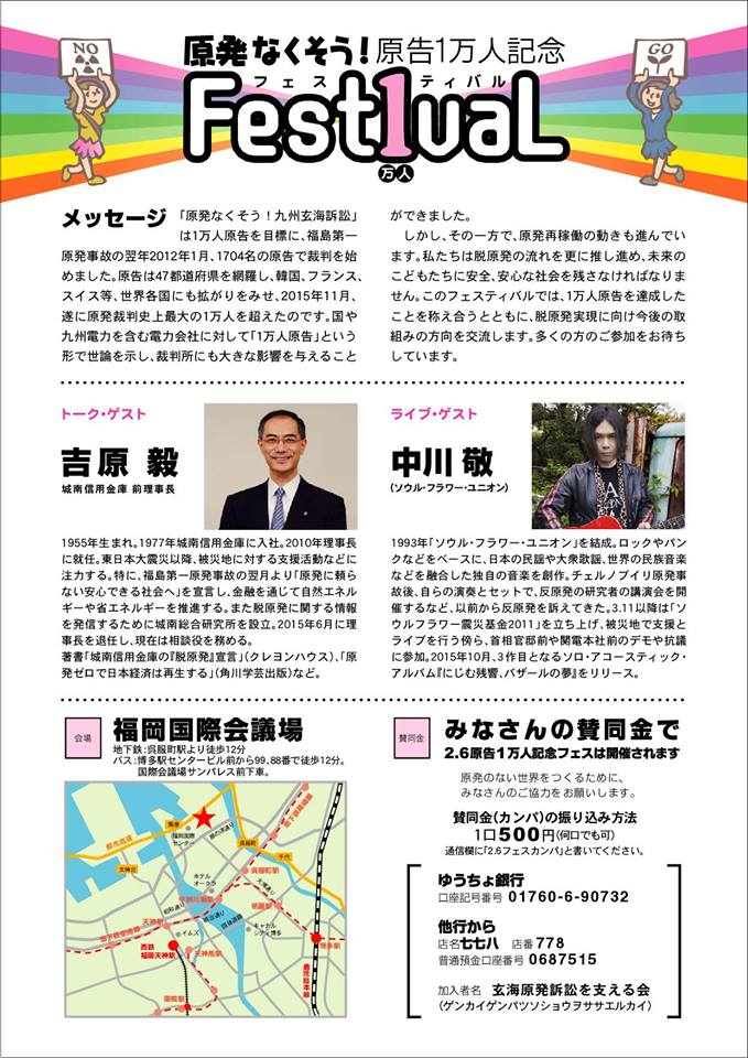 このフェスティバルでは、玄海原発をはじめ全国の原発の廃炉を求める市民たちが集まり原発の廃炉を求めていきます。城南信用金庫全理事長の吉原毅氏とソウル・フラワー・ユニオンの中川敬氏をゲストに招き、講演と音楽ライブで脱原発の思いを共有します。