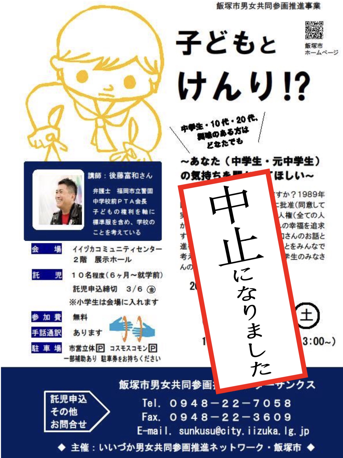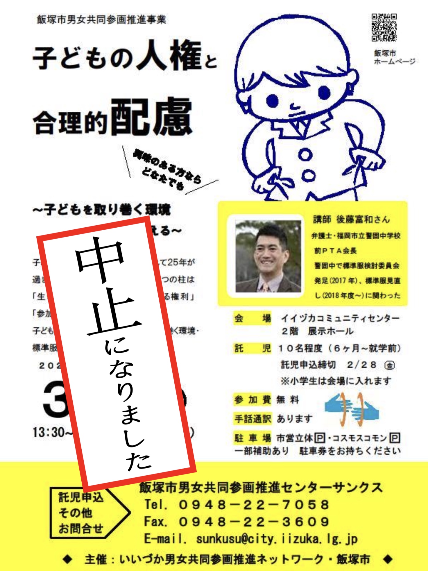 FacebookX 【お知らせ/飯塚での講演会中止のお知らせ】3月7日と3月14日に予定していましたいいづか男女共同参画推進ネットワーク、飯塚市主催による後藤富和弁護士の講演会については、新型コロナウイルス感染拡大防止のため中止となりました。参加を予定していた皆様申し訳ございません。 FacebookX