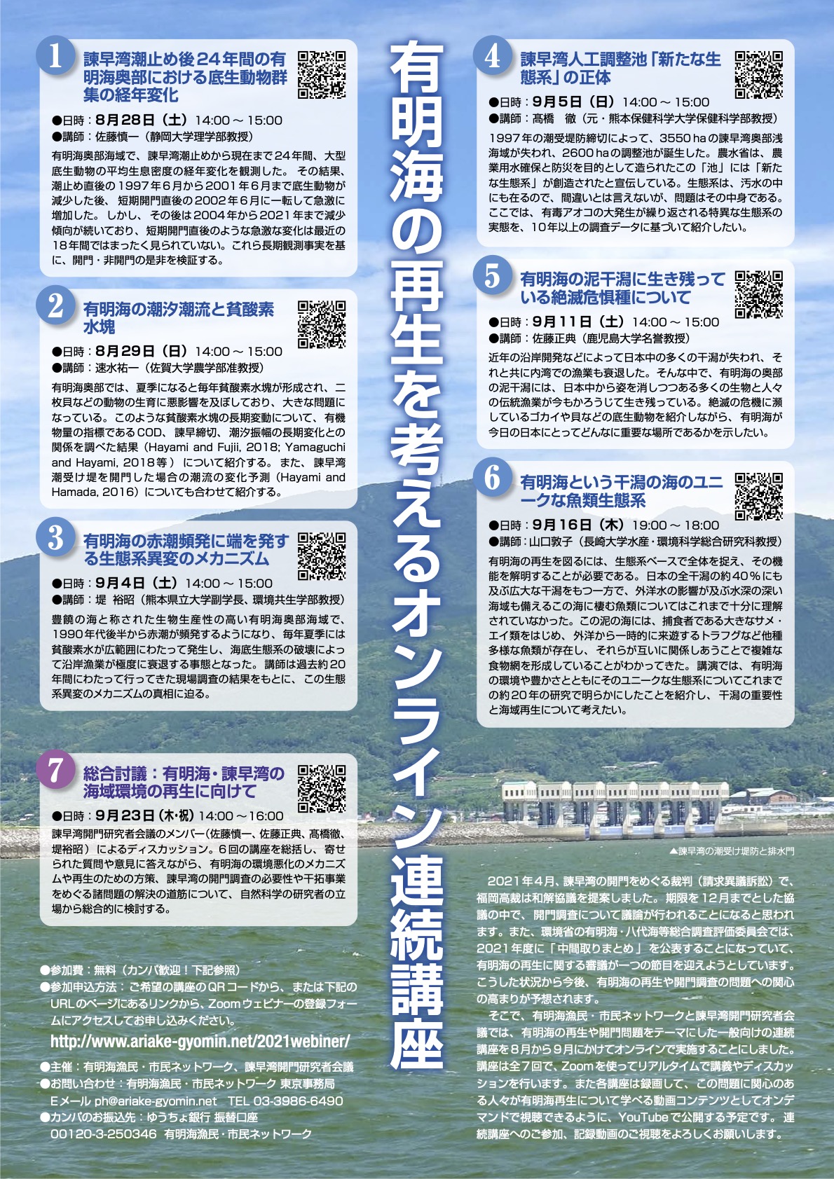 また各講座は録画して、この問題に関心のある人々が有明海再生について学べる動画コンテンツとしてオンデマンドで視聴できるように、YouTubeで公開する予定です。連続講座へのご参加、記録動画のご視聴をよろしくお願いします。