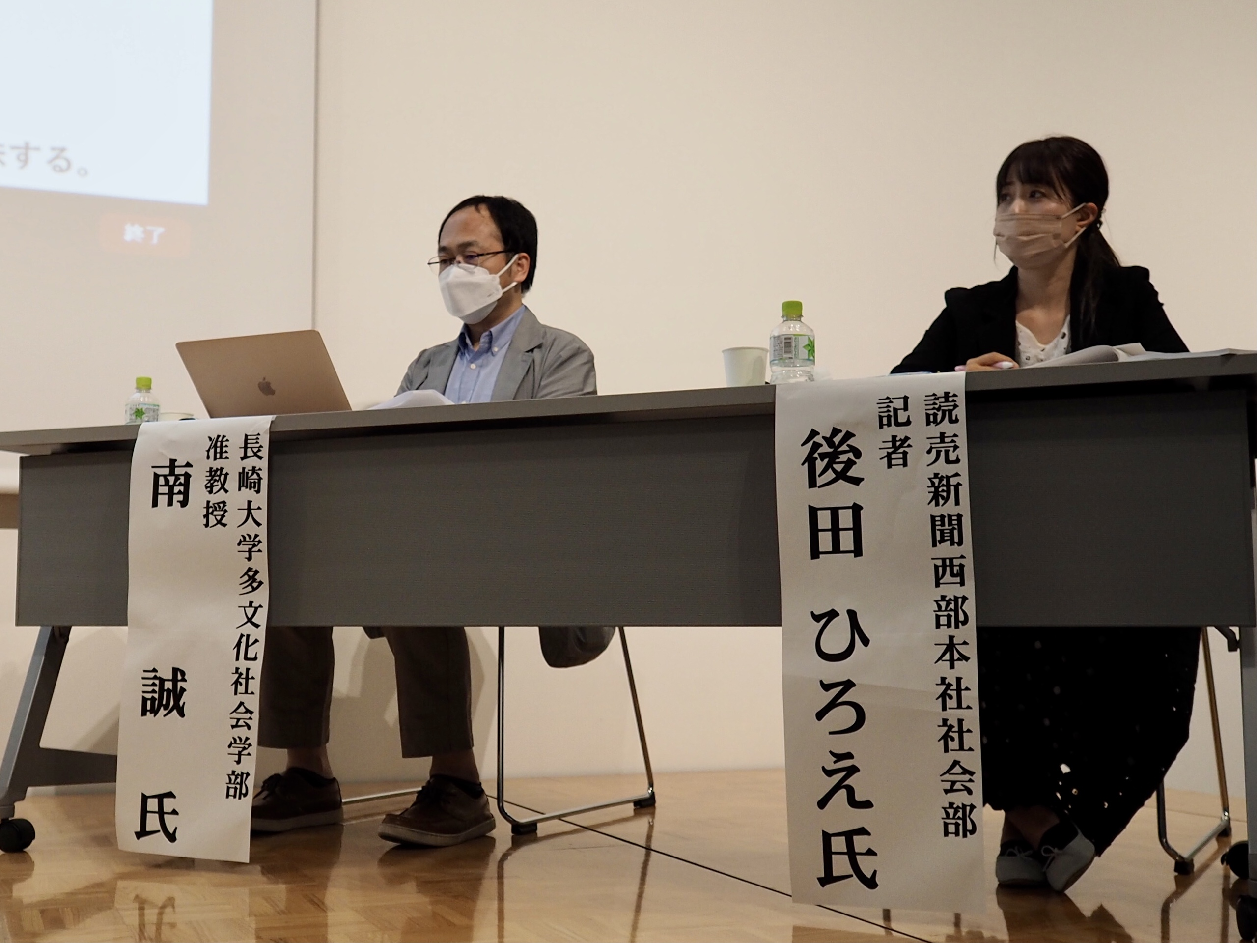 浅野慎一さん(摂南大学特任教授・神戸大学名誉教授)、南誠さん(長崎大学准教授)、後田ひろえさん(読売新聞記者)によるパネルディスカッション。