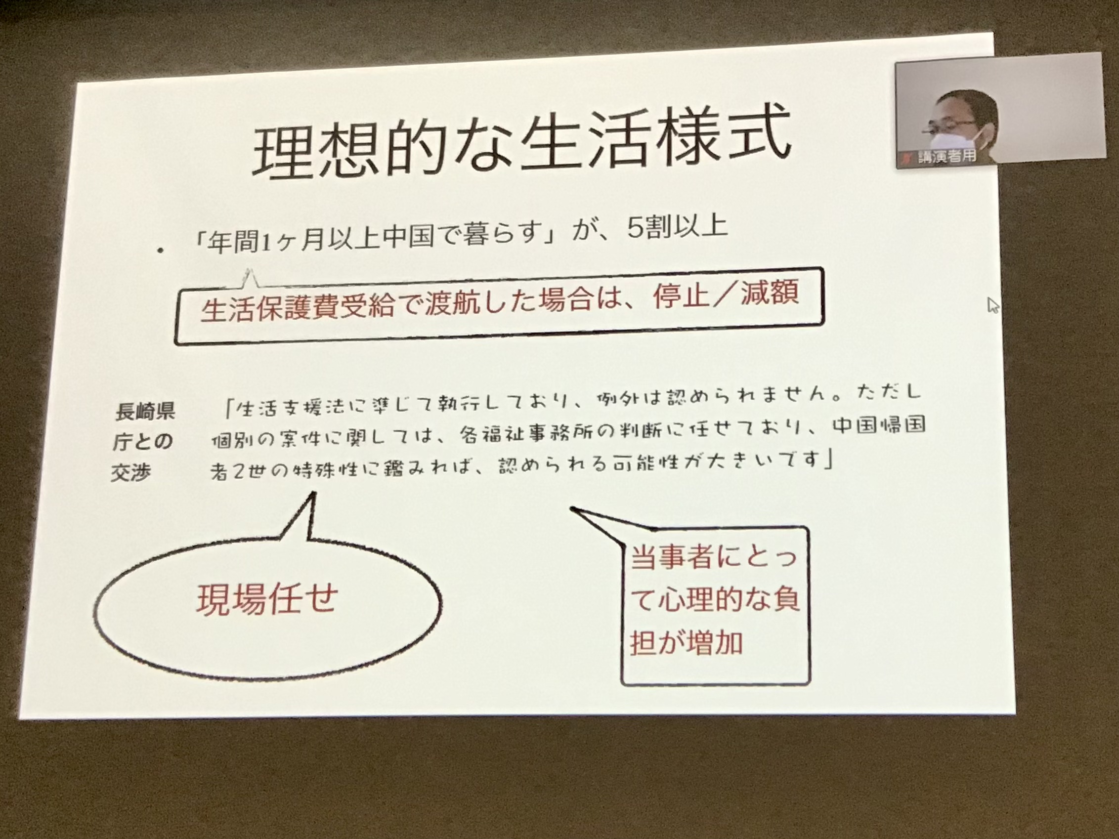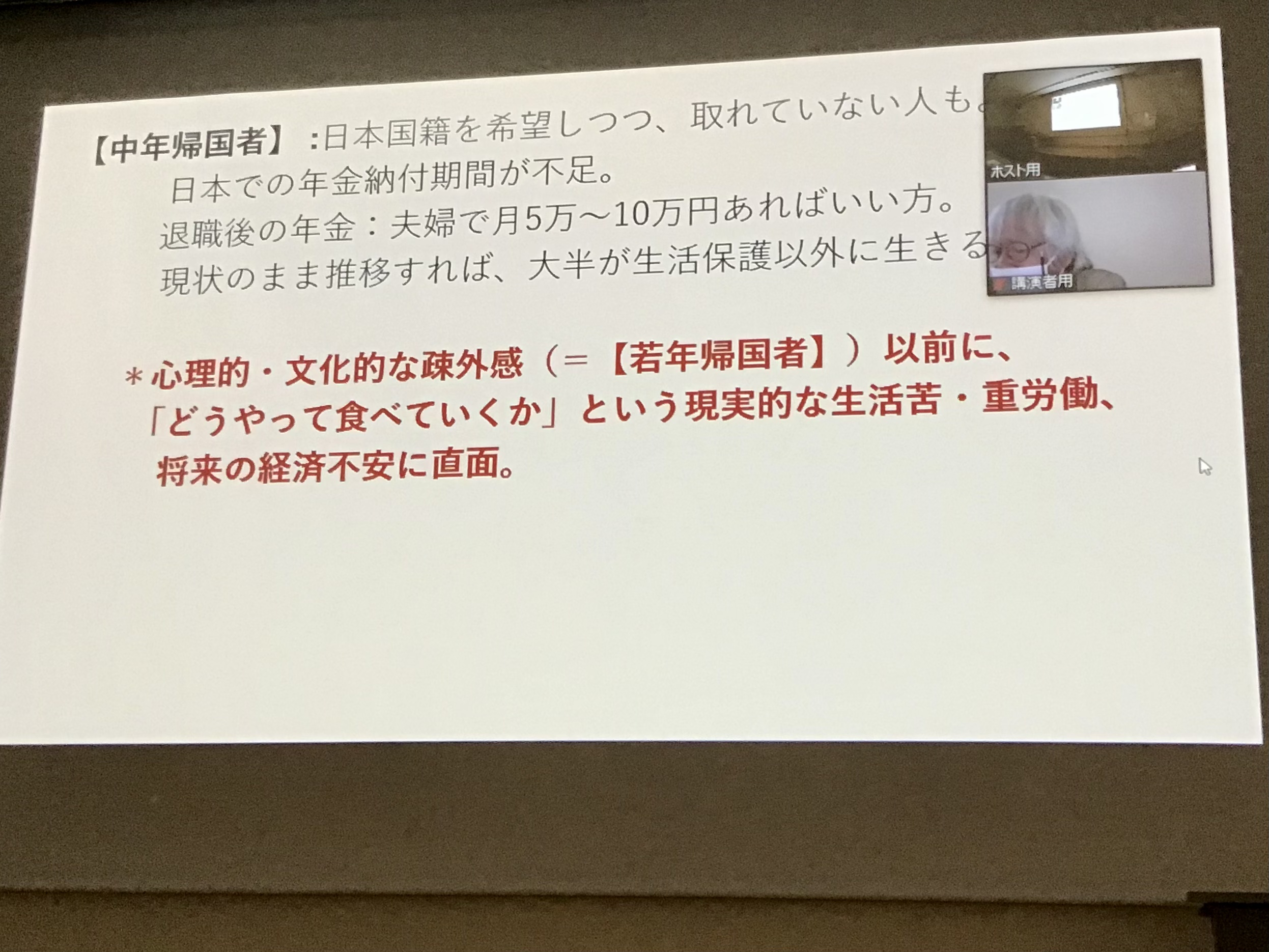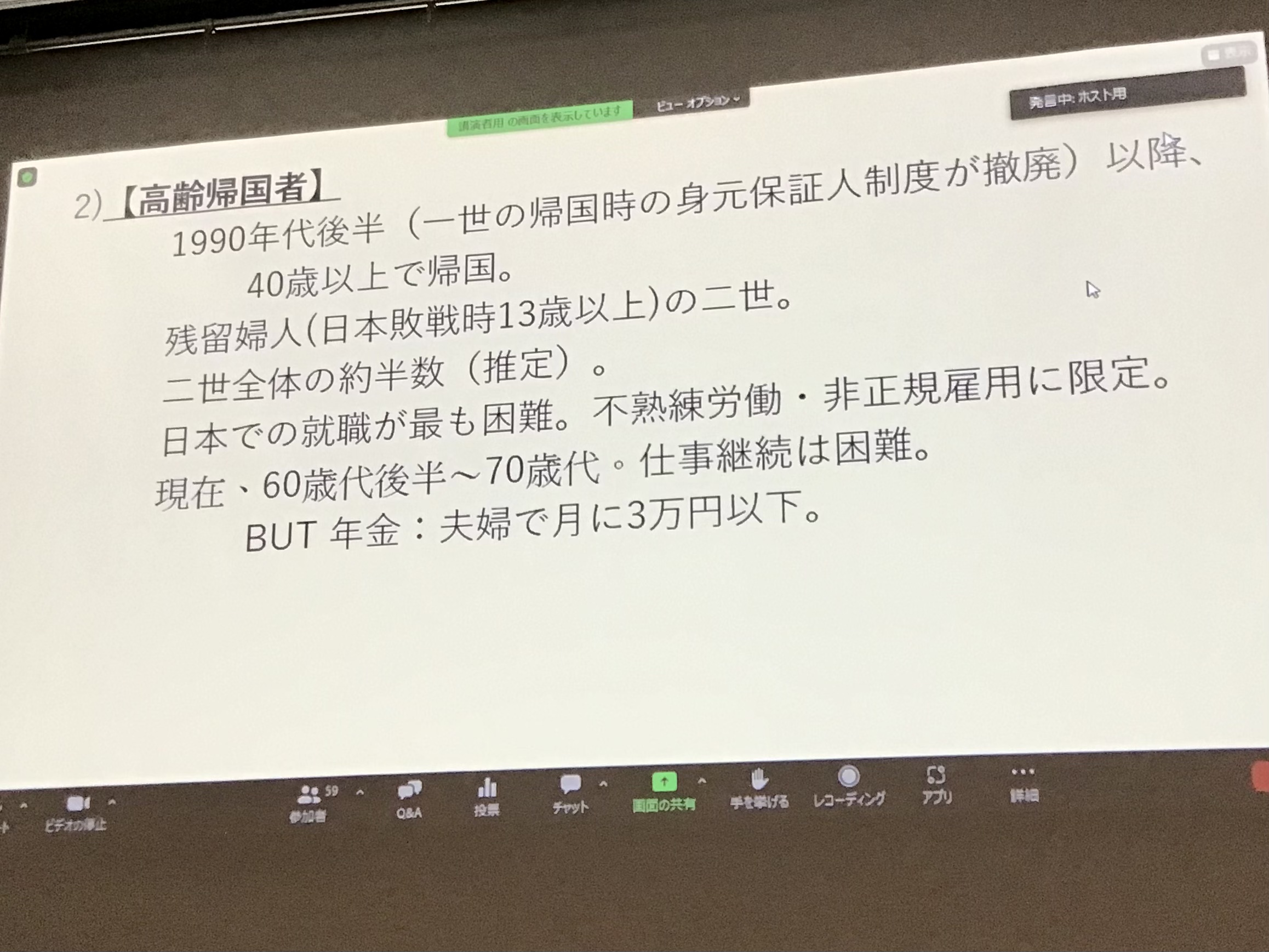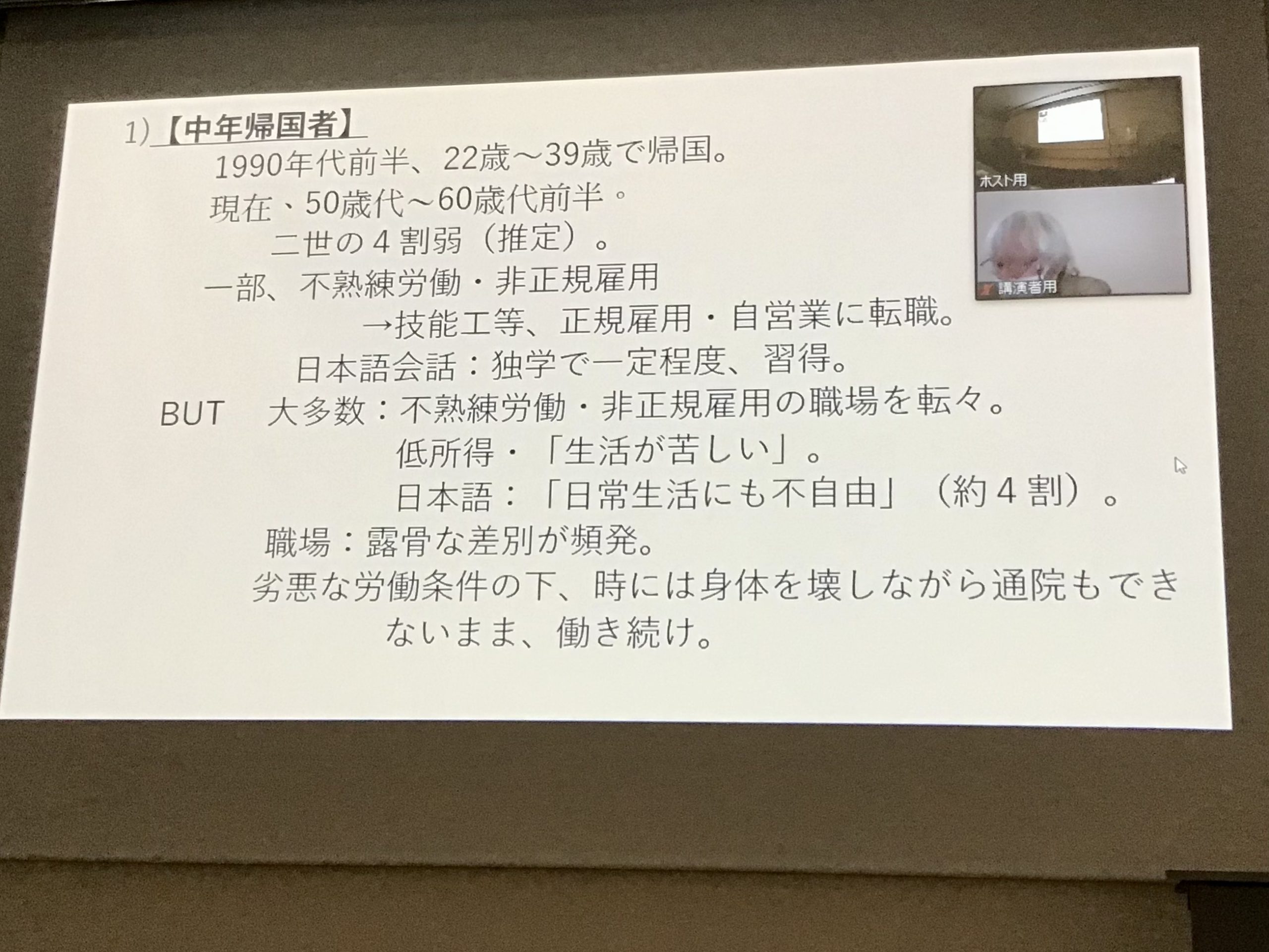 高齢の帰国者二世は生活保護水準以下の生活で就労を強いられている状況。