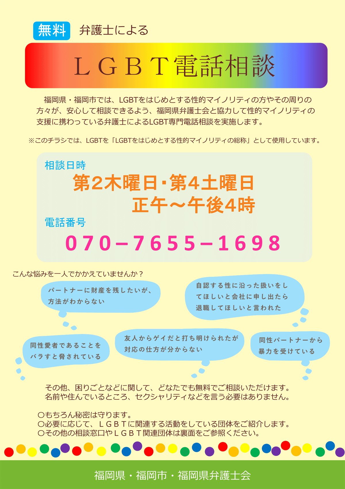 福岡県弁護士会では福岡市・福岡県と協力して「LGBT電話無料相談」を行なっています。