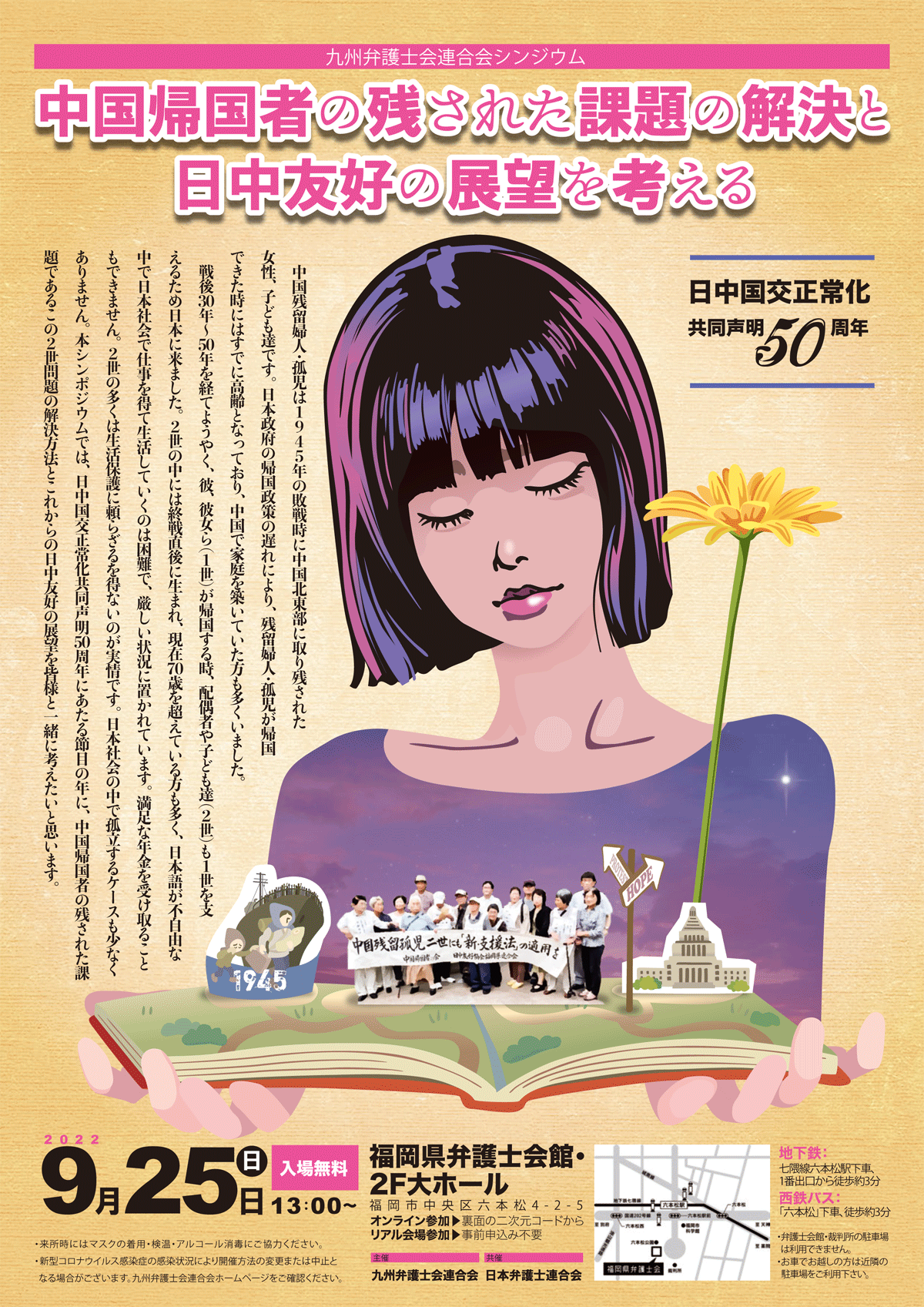 戦後30年~50年を経てようやく、彼、彼女ら(1世)が帰国する時、配偶者や子ども達(2世)も1世を支えるため日本に来ました。2世の中には終戦直後に生まれ、現在70歳を超えている方も多く、日本語が不自由な中で日本社会で仕事を得て生活していくのは困難で、厳しい状況に置かれています。満足な年金を受け取ることもできません。2世の多くは生活保護に頼らざるを得ないのが実情です。日本社会の中で孤立するケースも少なくありません。本シンポジウムでは、日中国交正常化共同声明50周年にあたる節目の年に、中国帰国者の残された課題であるこの2世問題の解決方法とこれからの日中友好の展望を皆様と一緒に考えたいと思います。
