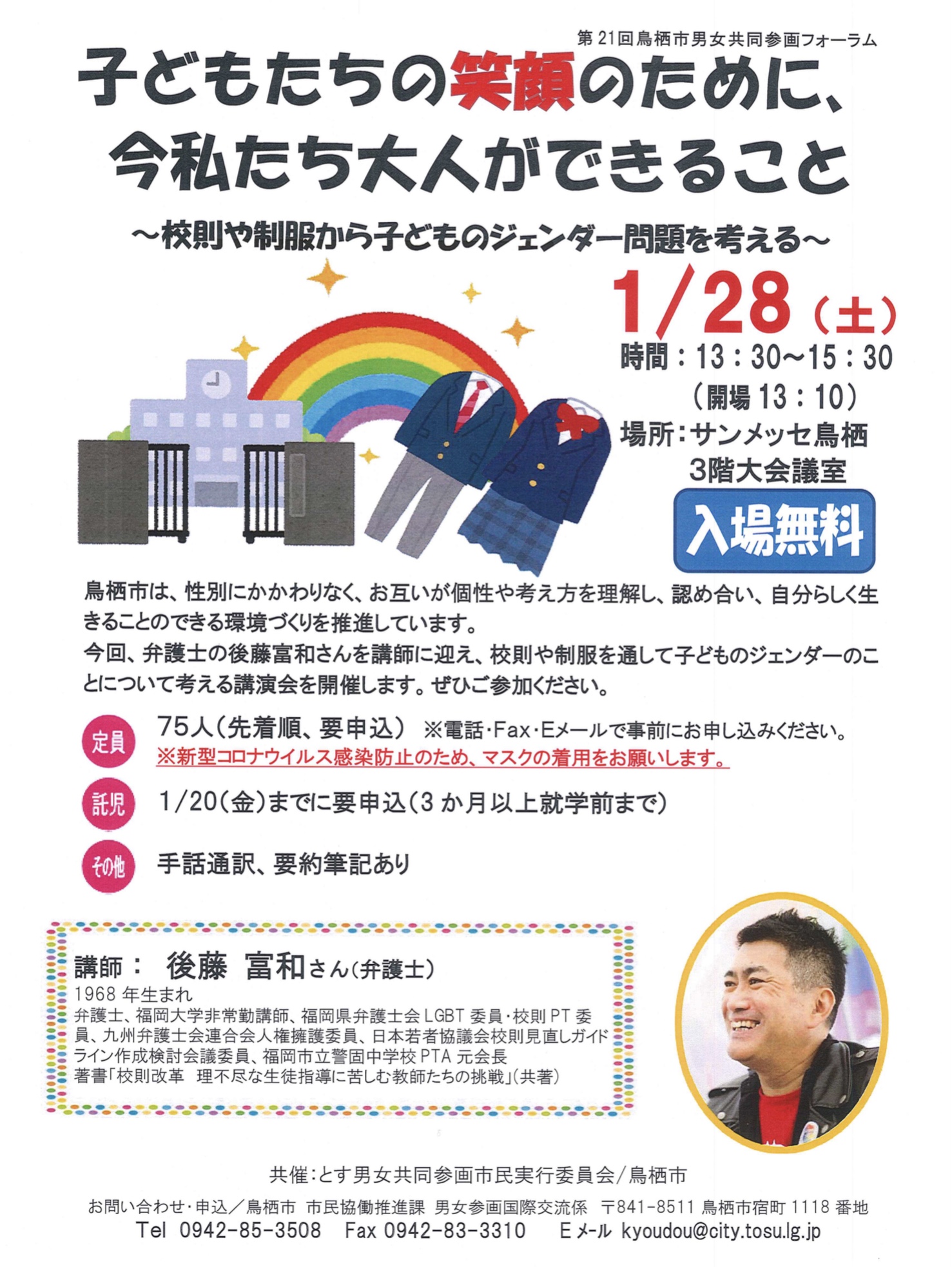 【今週末・鳥栖市】子どもたちの笑顔のために、今私たち大人ができること〜校則や制服から子どものジェンダー問題を考える〜