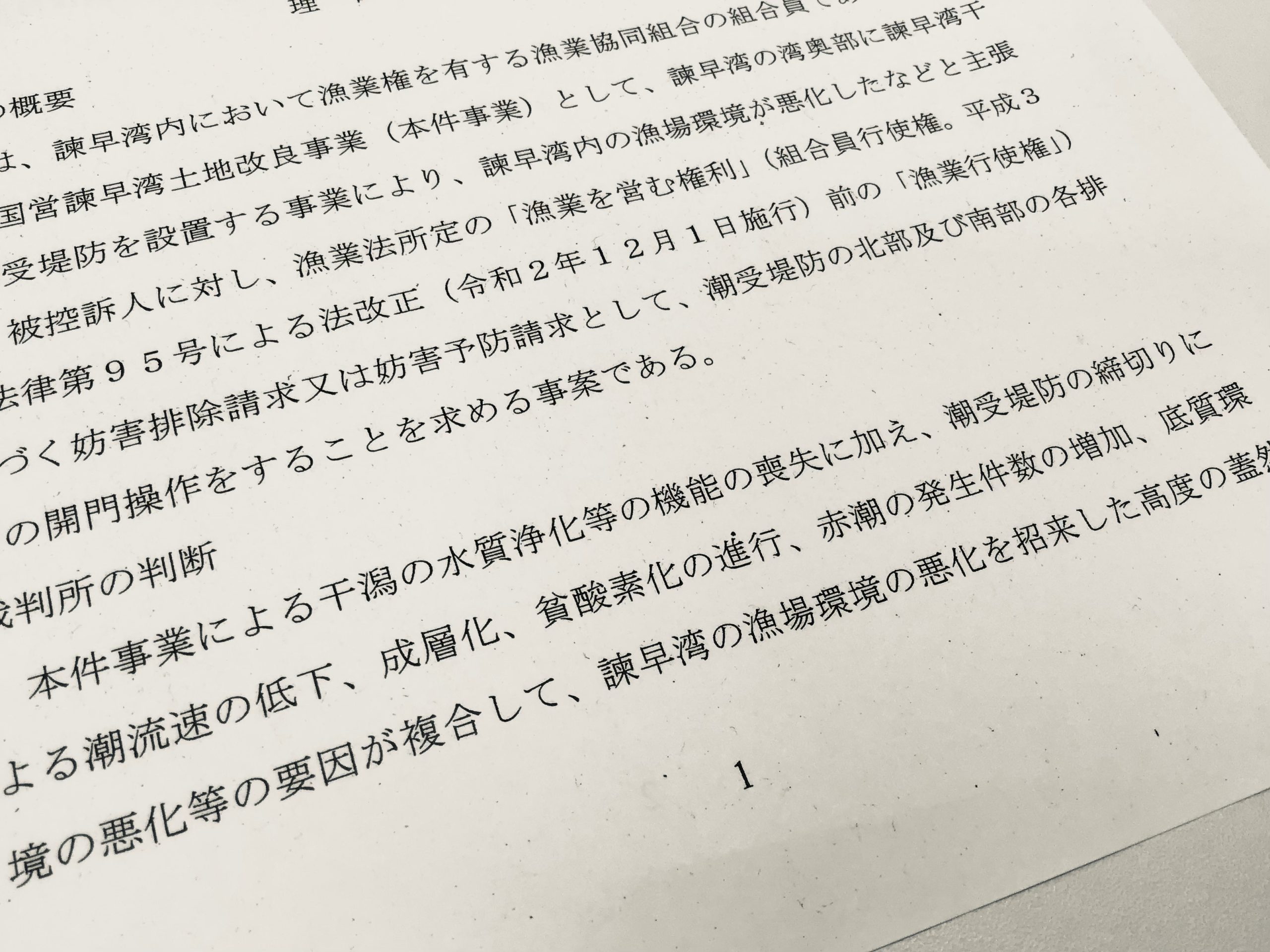 「本件事業(諫早湾干拓事業)による干潟の水質浄化等の機能の喪失に加え、潮受堤防の締切りによる潮流速の低下、成層化、貧酸素化の進行、赤潮の発生件数の増加、底質環境の悪化等の要因が複合して、諫早湾の漁場環境の悪化を招来した高度の蓋然性があると認めるのが相当であり、これにより、諫早湾におけるタイラギ漁業及び漁船漁業の漁獲量が減少し、かかる状態が将来にわたり継続することが具体的に予想され」る。