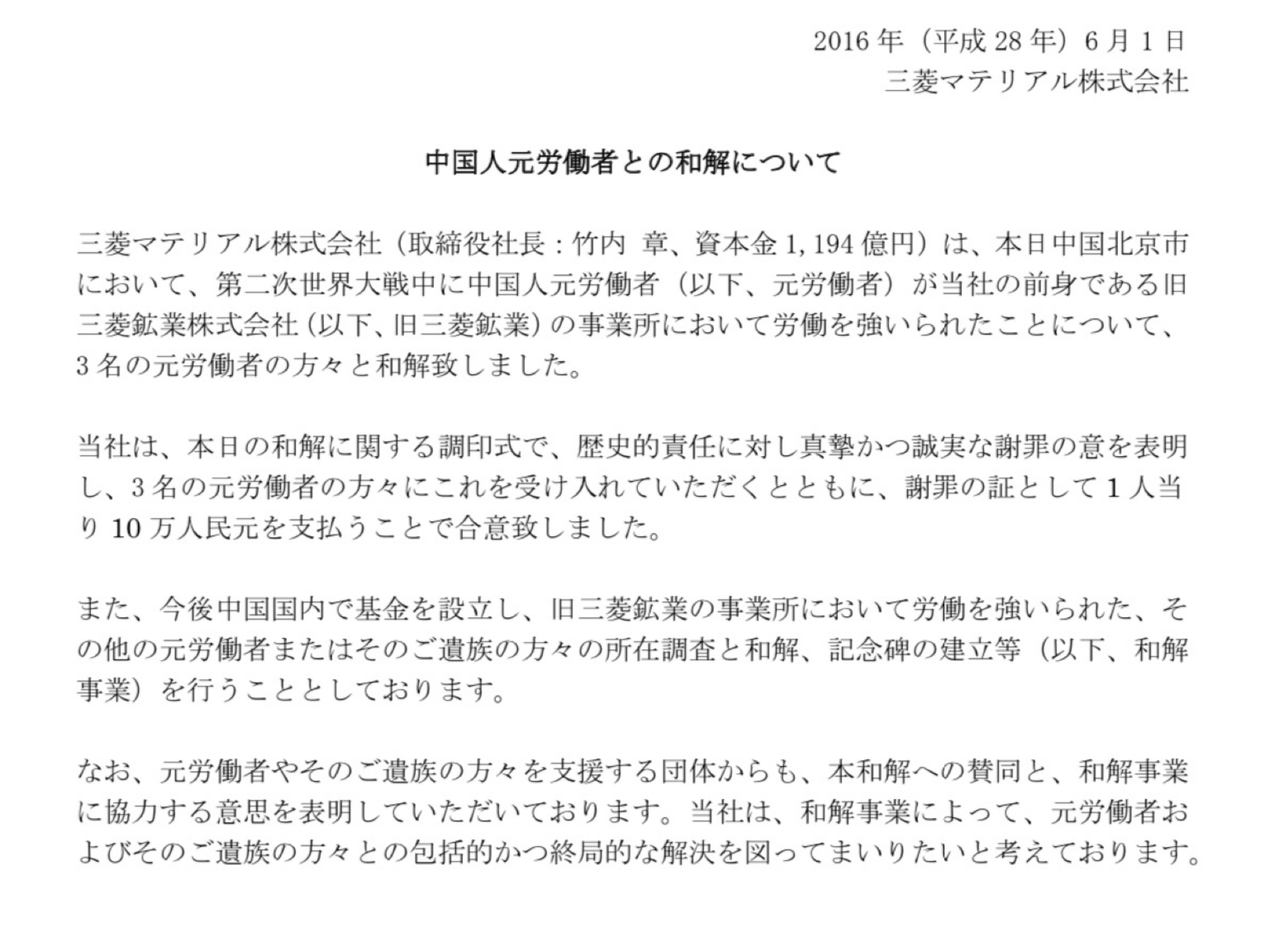 「中国人元労働者との和解について」三菱マテリアル株式会社(旧三菱鉱業株式会社)(2016)