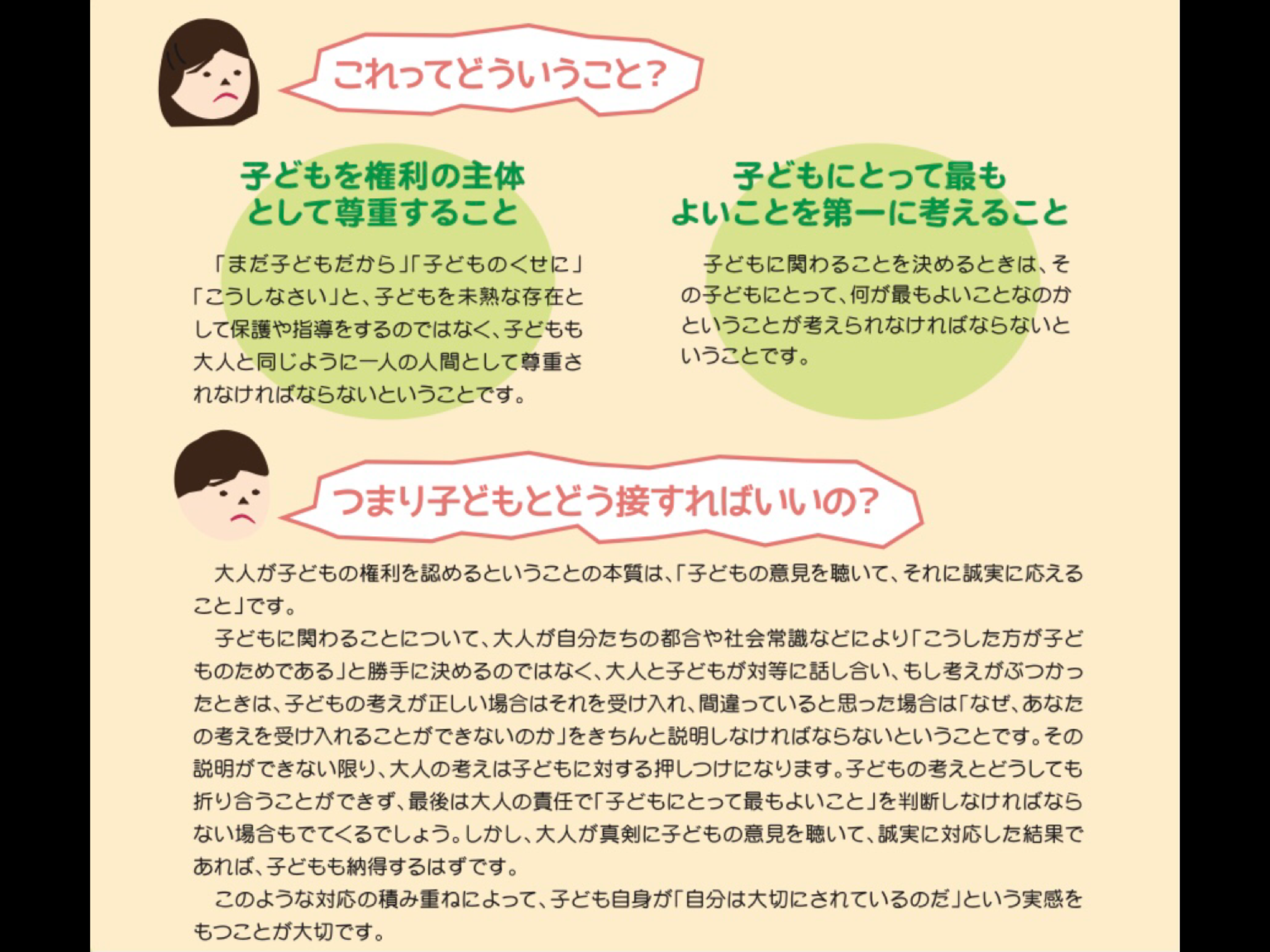 「まだ子どもだから」「子どものくせに」「こうしなさい」と子どもを未熟な存在として保護や指導するのではなく、子どもも大人と同じように一人の人間として尊重されなければならない。