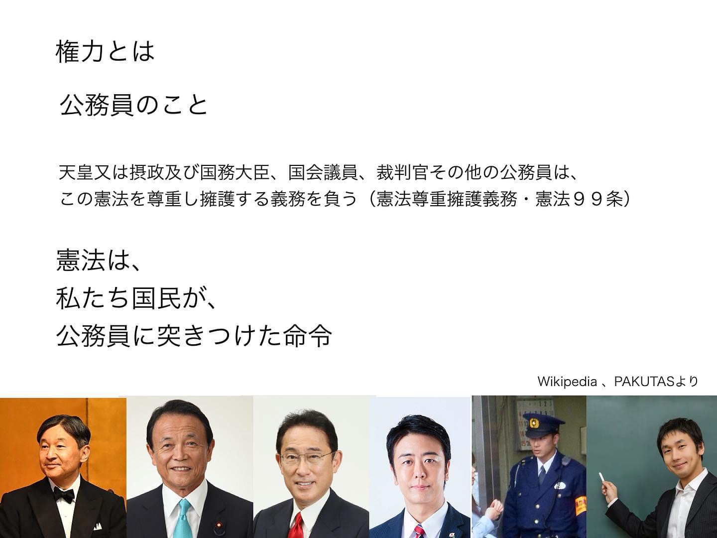 権力で市民を苦しめることのないよう、憲法によって厳格に縛られる立場です(憲法尊重擁護義務・憲法99条)。