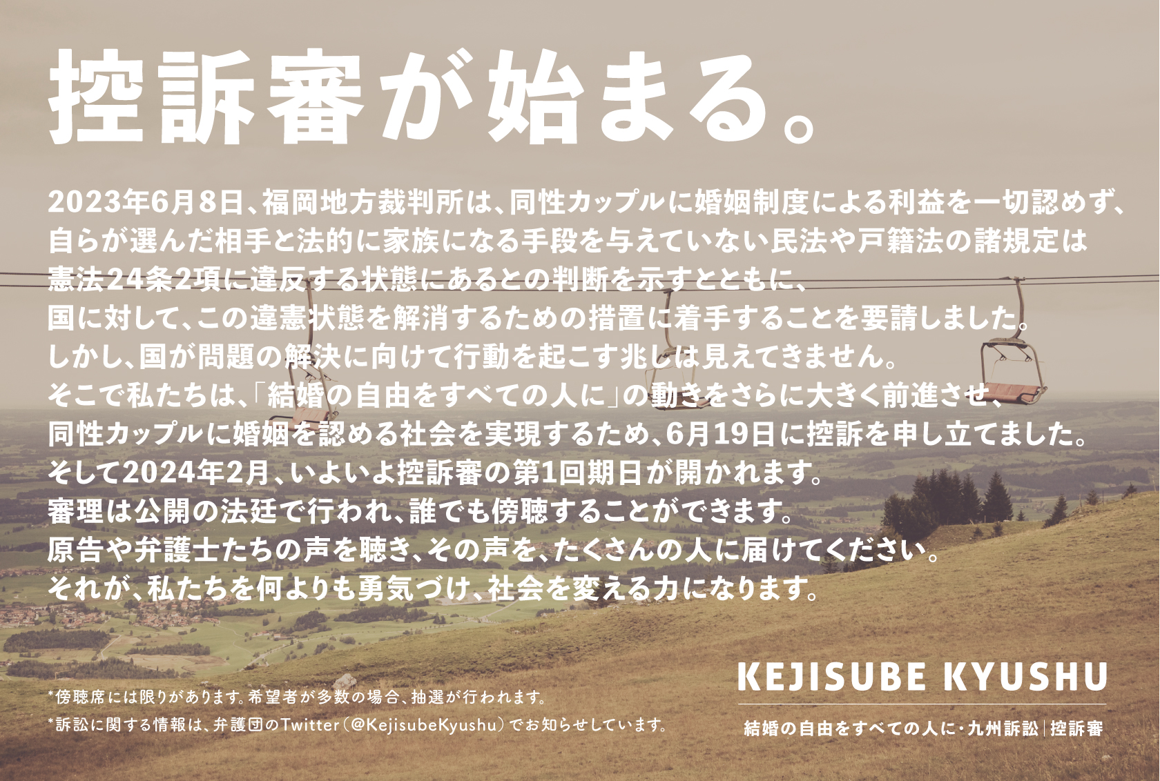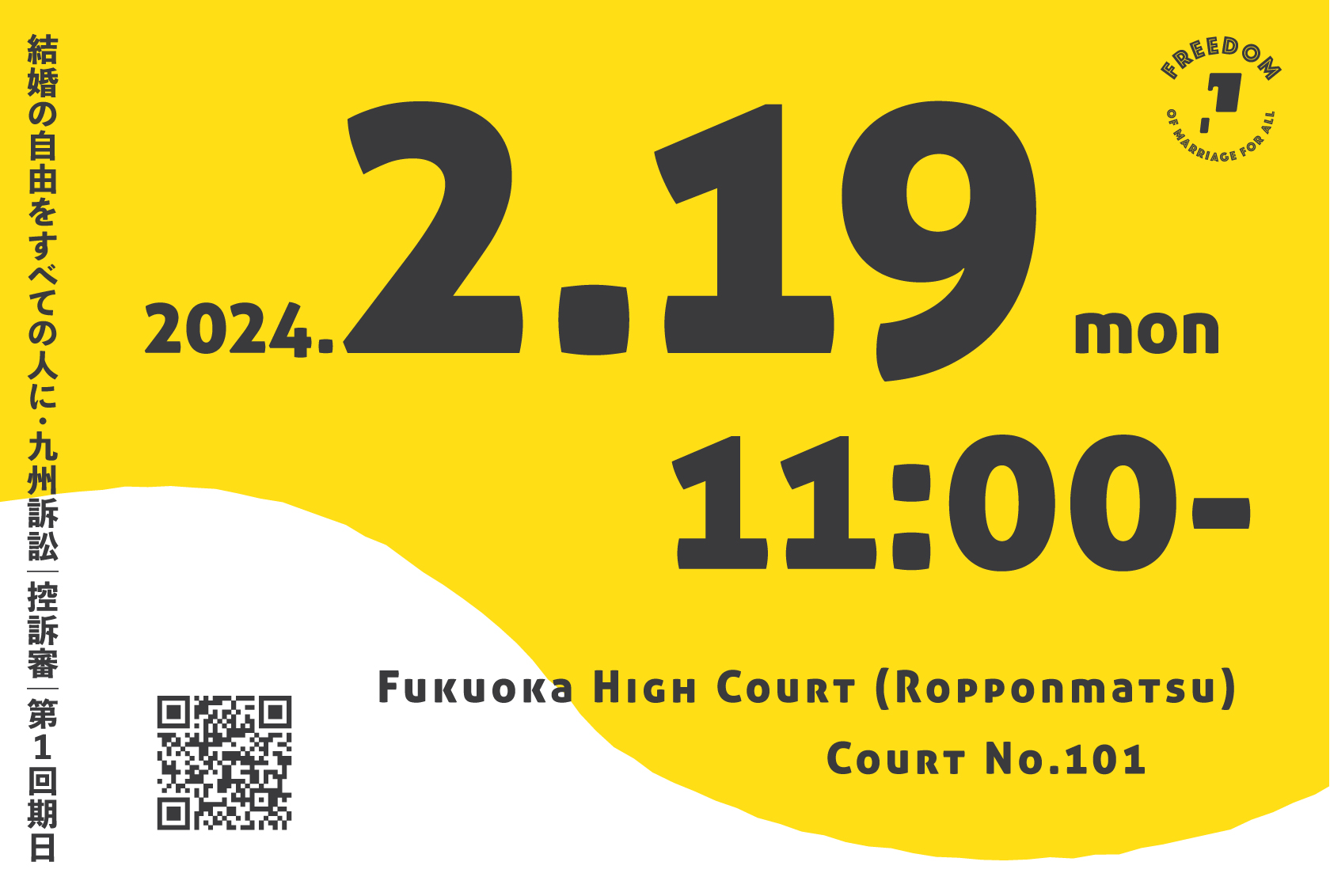 FacebookX 結婚の自由をすべての人に・九州訴訟控訴審第1回 控訴審始まる。 2月19日(月)11時(事前に傍聴抽選券配布の予定) 福岡高等裁判所101号法廷(福岡市中央区六本松) 後藤も法廷で意見を述べます。 どなたでも傍聴できます。ただし希望者多数の場合は抽選になります。 原告や弁護士たちの声を聴き、その声を、たくさんの人に届けてください。 それが、社会を変える力になります。 #結婚の自由をすべての人に #同性婚 #LGBTQ FacebookX