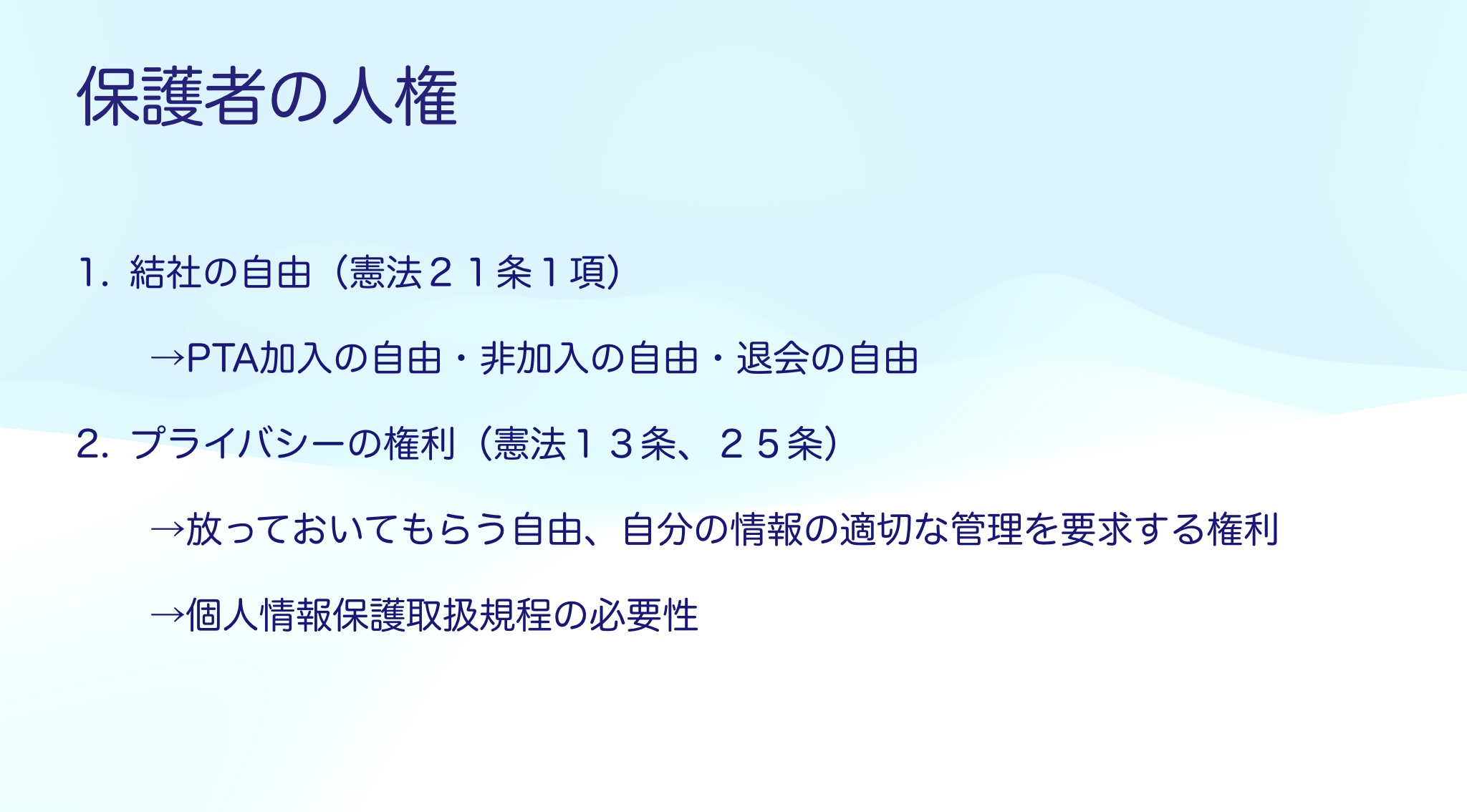 保護者からすると、PTA加入の自由は、憲法21条1項で保障された「結社の自由」とりわけ、入会の自由、非加入の自由、退会の自由の問題です。