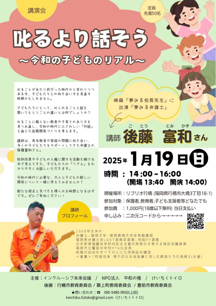 FacebookX この前の日曜日、インクルーシブ未来会議・NPO法人平和の種・けいちくトイロにお招きいただき行橋市で「叱るより話そう〜令和の子どものリアル〜」をテーマにお話ししました。 前日に満員御礼が出るほど大盛況。当日は立ち見まで。 保護者だけでなく、中高生や教師、管理職、教育委員会からも多数参加。 会場からたくさんの質問が寄せられ賛否両方あって大変興味深いものでした。 予定調和で終わるのではなく、様々な意見が出るってのが素晴らしいですね。 企画してくれた皆さんに感謝です。 #子どもの権利 FacebookX