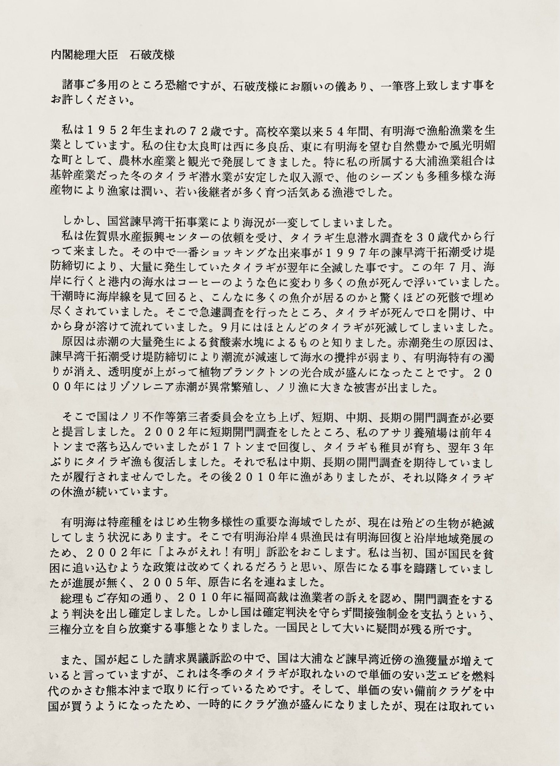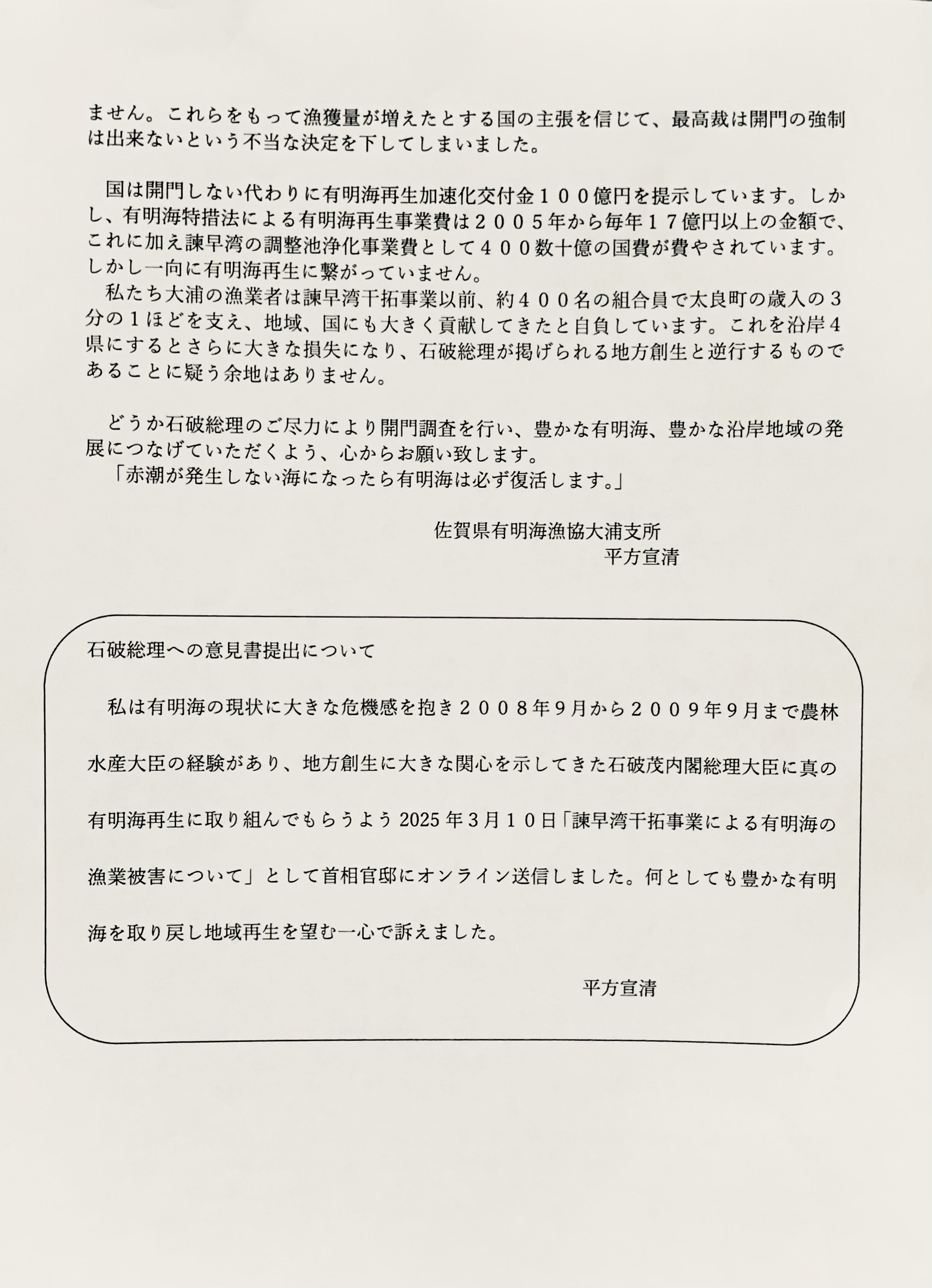 どうか石破総理のご尽力により開門調査を行い、豊かな有明海、豊かな沿岸地域の発展につなげていただくよう、心からお願い致します。赤潮が発生しない海になったら有明海は必ず復活します。